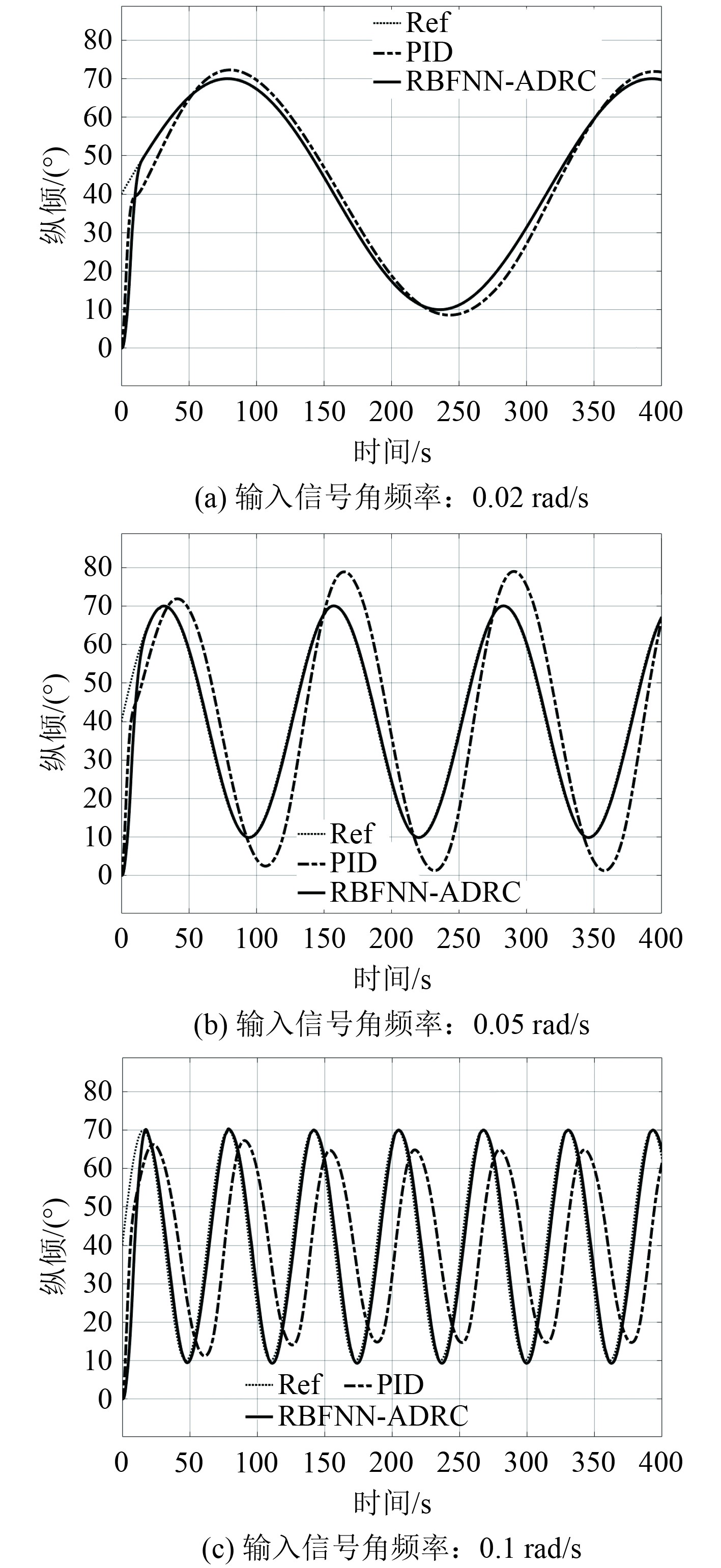 根据仿真结果可知,基于RBFNN-ADRC复合型控制器的控制系统动态跟踪效果非常好,基本能够跟上输入信号;而PID控制器的跟踪效果就不是十分理想,在频率较低的输入信号下能够跟上,但随着输入信号频率的增大则会产生非常大的滞后。
