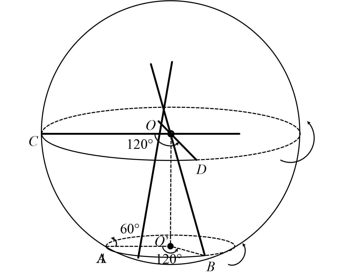 大纵倾角下的航向控制模拟运动过程如图2。在0°纵倾角的情况下,从状态D运行到C,只需要单纯控制航向角偏差120°即可;而在纵倾角为60°的情况下,从B轴运动到A轴,则需要在保持纵倾角不变的情况下调整航向角偏转120°。此时使用一组水平差动推进器的AUV在进行航向控制时,纵倾势必会随之变化,会产生严重的航向控制与纵倾控制耦合问题。这两者的控制耦合问题为研究核心。