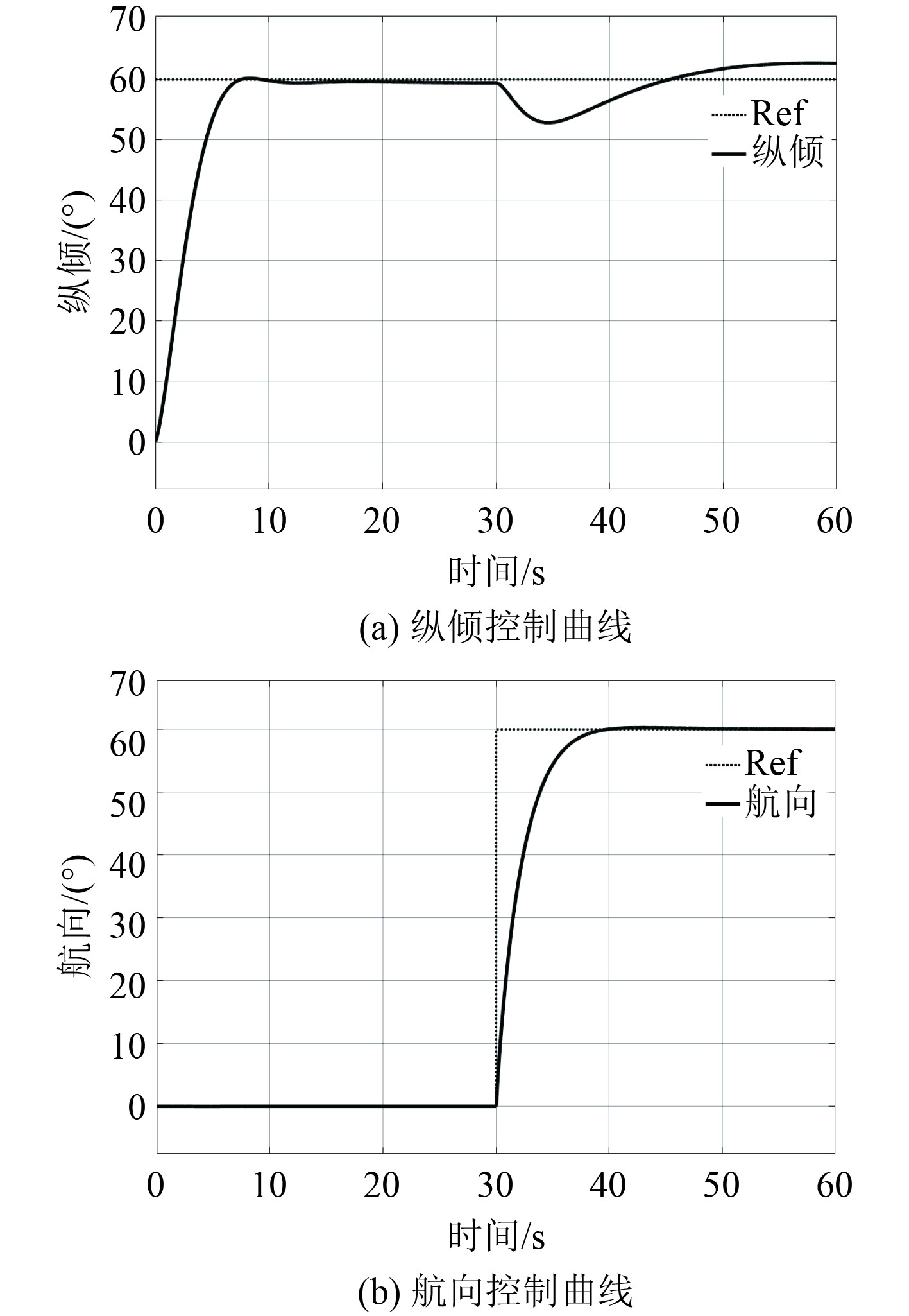 为验证大纵倾角下纵倾与航向控制耦合现象,进行AUV模型纵倾与航向控制仿真实验,对纵倾与航向控制通道设置PID控制器。设定纵倾通道输入幅值为60°的阶跃信号,在航向通道30 s时刻输入幅值为60°的阶跃信号,即航向角于纵倾稳定后再进行控制。