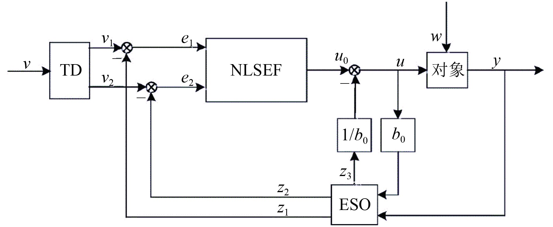 自抗扰控制技术(Active Disturbance Rejection Control,ADRC)是在经典PID控制框架基础上演进的新型控制策略,继承其误差反馈控制的核心[10]。自抗扰控制器包含3大主要结构:跟踪微分器(Tracking Differentiator,TD),扩张状态观测器(Extended State Observer,ESO)和非线性状态误差反馈(Nonlinear State Error Feedback,NLSEF)。其控制系统框图如图4所示。