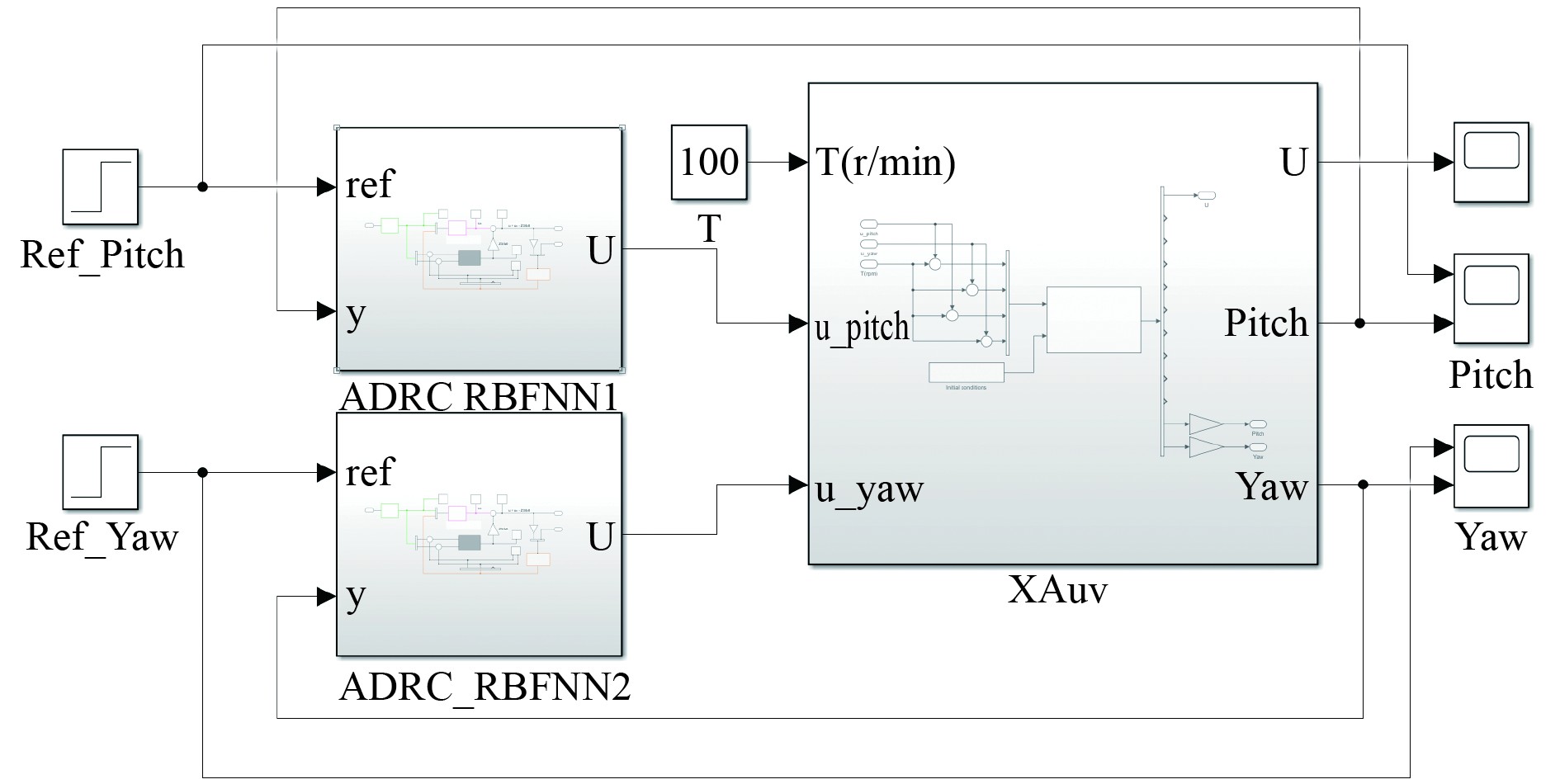 图 9 RBFNN-ADRC解耦系统仿真模型 Fig. 9 RBFNN-ADRC decoupling system simulation model |
