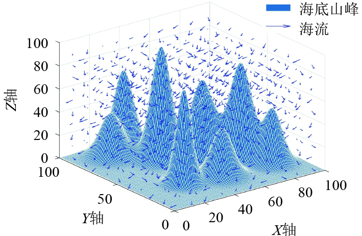 根据上述公式在长宽高为100 m×100 m×100 m的三维空间内,随机生成受海流影响的三维海底山峰障碍物模型,如图1所示。