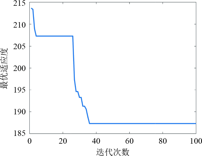 步骤9 终止条件判断。判断是否到达种群数,若未到达则返回步骤3,若到达则迭代值加1,并判断是否到达最大迭代值,若到达则输出最优适应度,若未到达则返回步骤2。