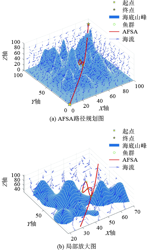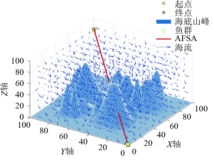 以上传统路径规划算法,在处理简单复杂度的路径规划问题时,能够表现出高效、准确的特性。然而,传统算法在面对高维度、非线性的复杂水下环境时,存在计算量大、实时性差、难以适应环境变化等缺陷。针对传统路径规划算法的局限性,众多学者提出群智能优化算法。这类算法通过模拟自然界生物的集体行为,利用个体之间的信息共享与协作,能够在复杂的环境中实现高效的路径规划。且该种算法具有自适应性强和灵活性高的特点,能实时调整路径,快速响应环境变化,从而克服传统算法的局限。Zhang等[12]提出一种多策略改进人工鱼群方法,提高了算法在路径规划时的收敛效率,避免算法陷入局部最优。Zhao等[13]通过引入定向因子、概率权重因子、自适应算子、路径平滑策略4种方法改进人工鱼群算法,提高了算法收敛速度、路径质量以及避免陷入局部最优。马小陆等[14]采用双向搜索策略改进人工鱼群算法,提高了算法的路径搜寻效率,但由于采用双向搜索策略导致鱼群个体复杂度提升,容易陷入局部最优。高金喆等[15]通过融合遗传算法改进人工鱼群算法从而减小机器人巡检过程种的转弯幅度,提高了巡检机器人的运行效率。虽然遗传算法通常具有较好的全局搜索能力,但在早期阶段可能出现收敛速度变慢的情况。