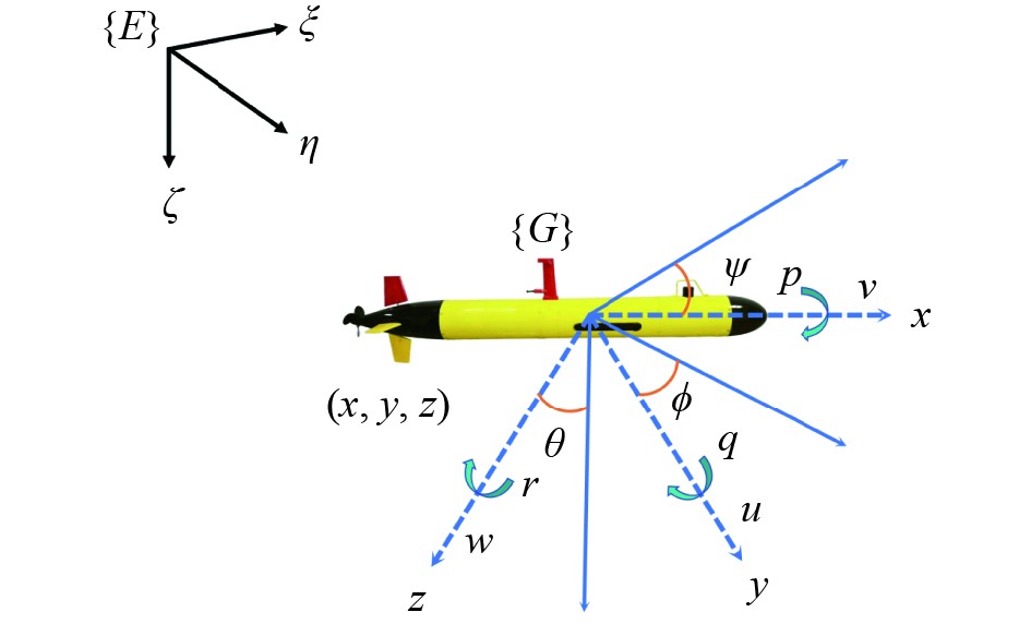 2)本体坐标系(G−xyz):固定于AUV本体,以重心为坐标系{G}的原点。其中,x轴沿AUV前进方向指向艏部,y轴通过重心指向右舷,z轴垂直向下。由于重心位于浮心下方,当AUV发生横摇或纵摇时会产生复原力矩以保障机械稳定性。