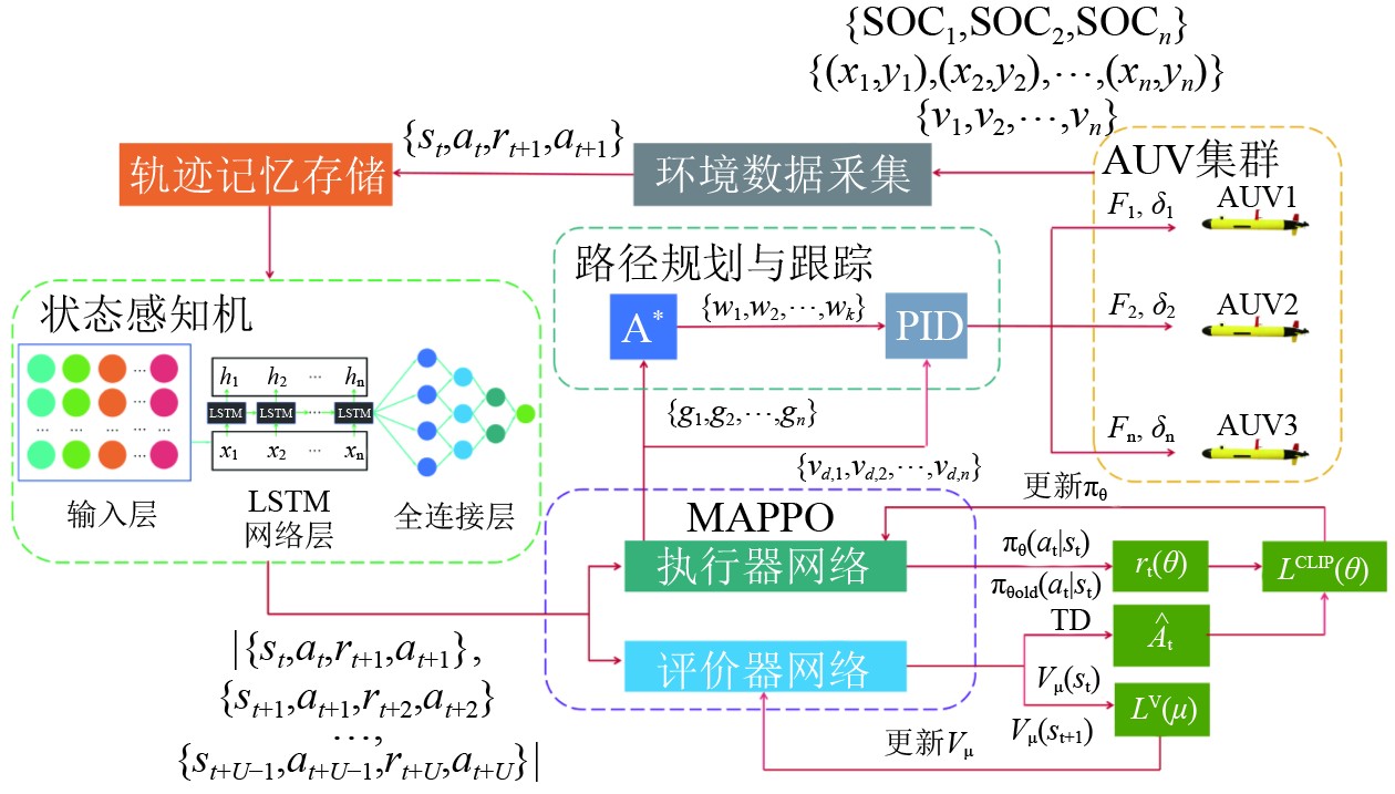 多智能体强化学习为AUV集群中的协同决策与能量管理提供了新的解决方案。该方法能够模拟复杂环境中智能体之间的交互行为,具备良好的实时自适应能力,特别适用于海洋环境下的动态任务分配与能量优化。本研究提出一种融合长短期记忆-多智能体近端策略优化(Long Short-Term Memory - Multi-Agent Proximal Policy Optimization,LSTM-MAPPO)深度强化学习、A星(A-star,A*)路径规划与比例-积分-微分控制(Proportional-Integral-Derivative Control,PID)的多智能体能量管理任务分配策略。该策略通过LSTM捕捉智能体在复杂环境下的能耗动态特征,结合改进的MAPPO实现集群内的任务自适应分配与能耗感知优化决策,配合PID控制器完成对路径跟踪与动态调节的高精度控制,从而形成“全局决策-路径规划-精准控制”的闭环,可有效抑制AUV集群能量短板效应。