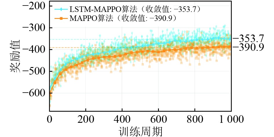 图4为LSTM-MAPPO算法与标准MAPPO算法的性能对比分析结果,经过