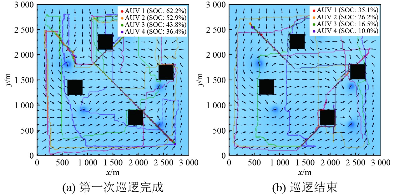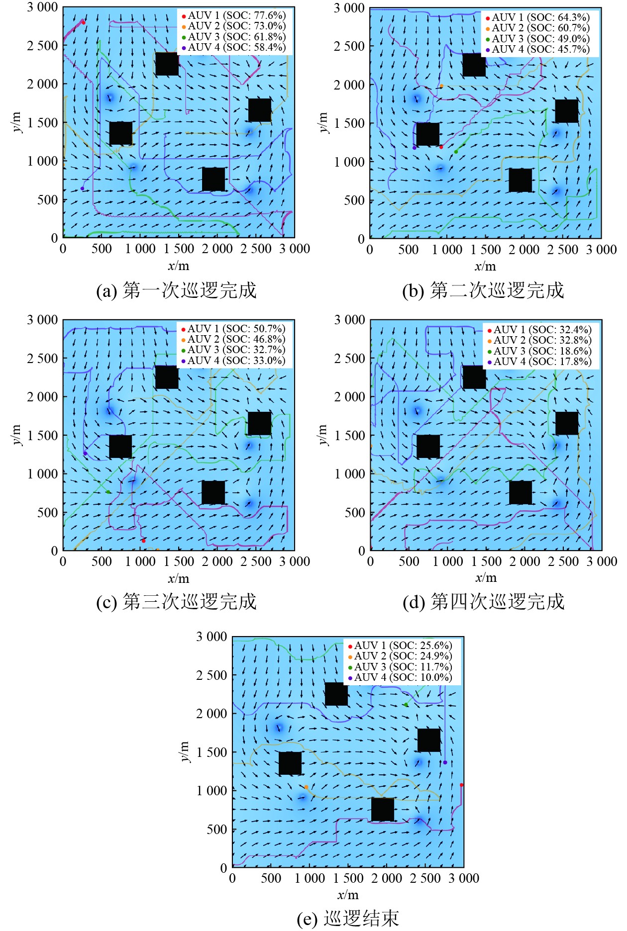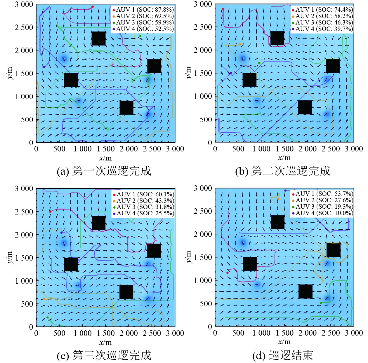 设置4台AUV进行巡逻任务,当最低电量AUV的SOC低于10%时停止巡逻任务,4台AUV的初始位置对称分布于地图中心区域,坐标分别为(