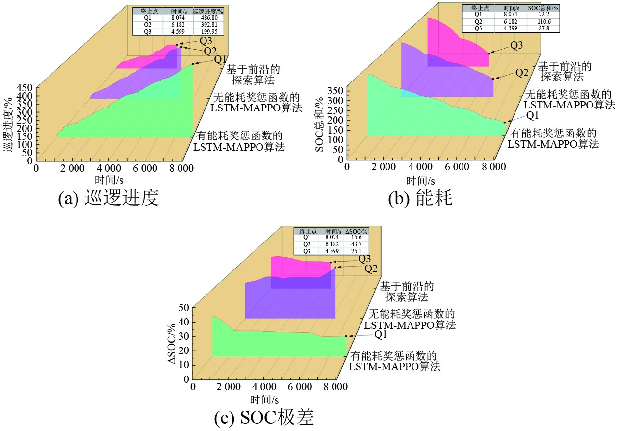 2)有能耗奖惩函数的LSTM-MAPPO算法相较于无能耗奖惩函数的LSTM-MAPPO算法,在保持平均巡逻时间和能耗水平稳定的基础上,巡逻覆盖率提升了23.9%,SOC极差降低了64.3%,表明该算法可有效解决“能量短板效应”问题,提高了整体系统能效。
