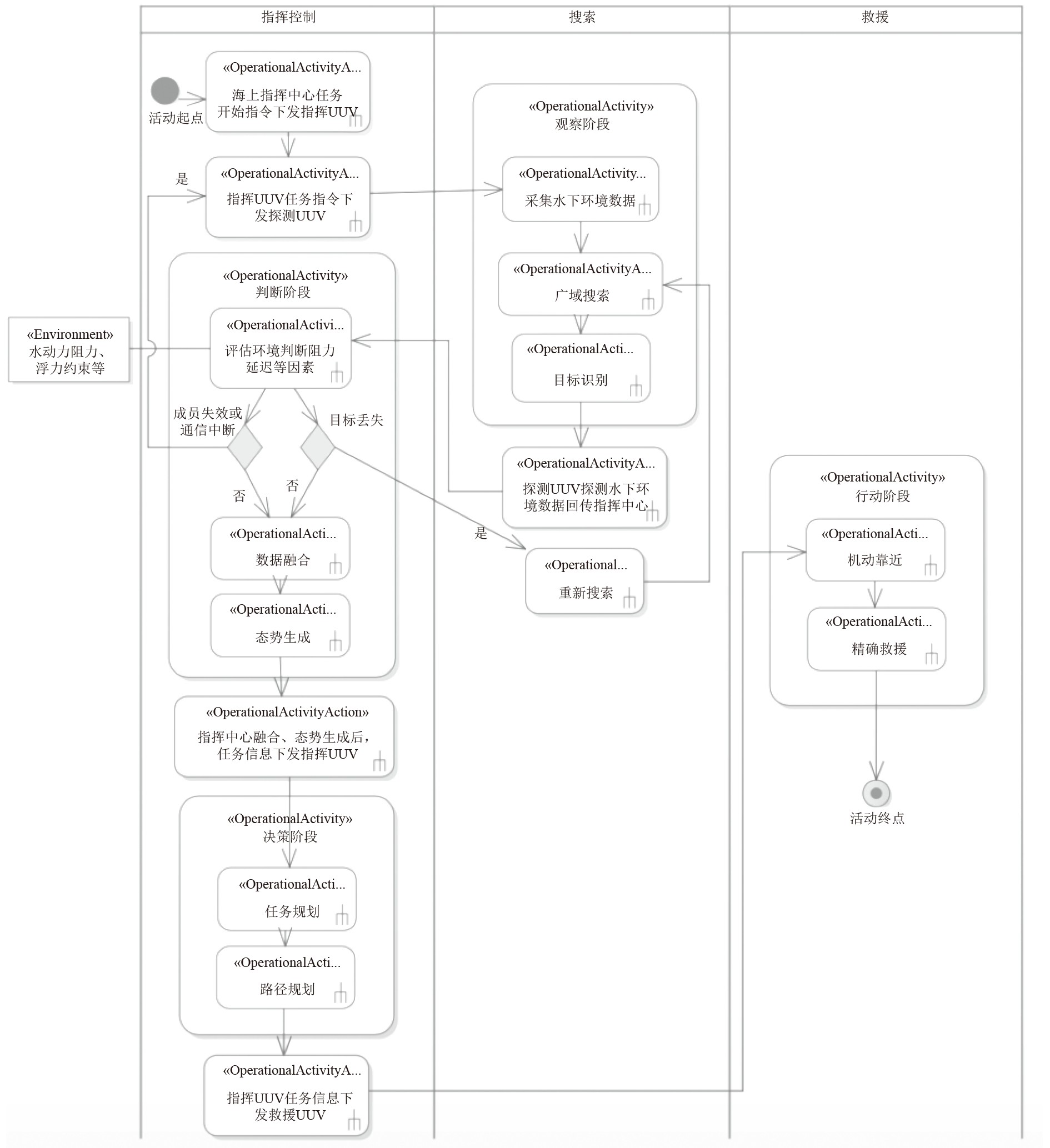 如图11所示,任务活动模型(OV-5b)以流程图形式描述任务活动的执行顺序、输入/输出及触发条件,任务活动模型区别于OV-5a的静态分解,OV-5b动态展示活动间的时序、并行或反馈关系。针对水下环境的特殊性,本模型构建了系统与环境的交互机制,具体体现于观察、判断与决策3个核心阶段。在观察阶段,采集环境数据被设为并发活动,用于持续感知水声信道状态及海洋物理场参数;在判断阶段,模型新增评估环境约束活动,重点分析水动力阻力对系统机动性的影响及声呐通信质量对数据回传过程的制约;在决策阶段,路径规划与任务分配的决策逻辑需纳入海洋物理场预测信息,以此生成具备环境适应性的行动方案。