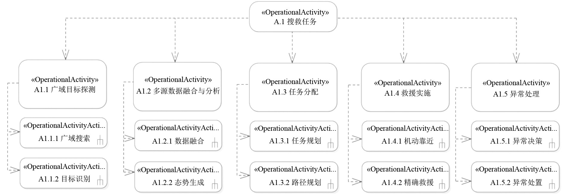 如图12所示,任务活动分解模型(OV-5a)主要明确活动的父子关系与粒度层级。任务活动分解模型将任务分解为可执行的子活动,并通过树状图形式进行展示。