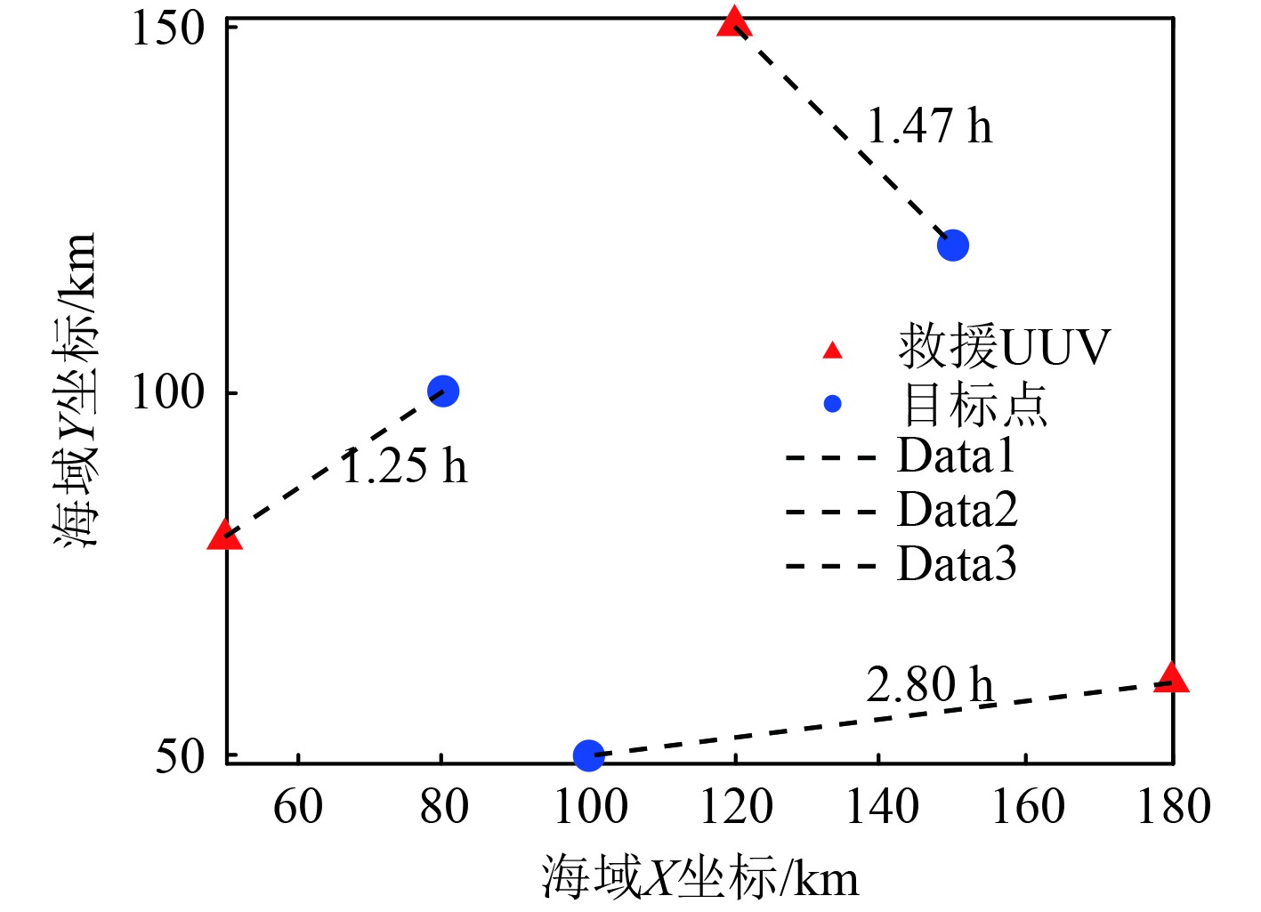 当探测UUV发现目标(假设仿真中设置3个失事目标点),指挥UUV通过改进匈牙利算法实现救援UUV与目标点的最优匹配,目标函数为最小化总救援时间,含机动时间与通信时延,如图21所示。