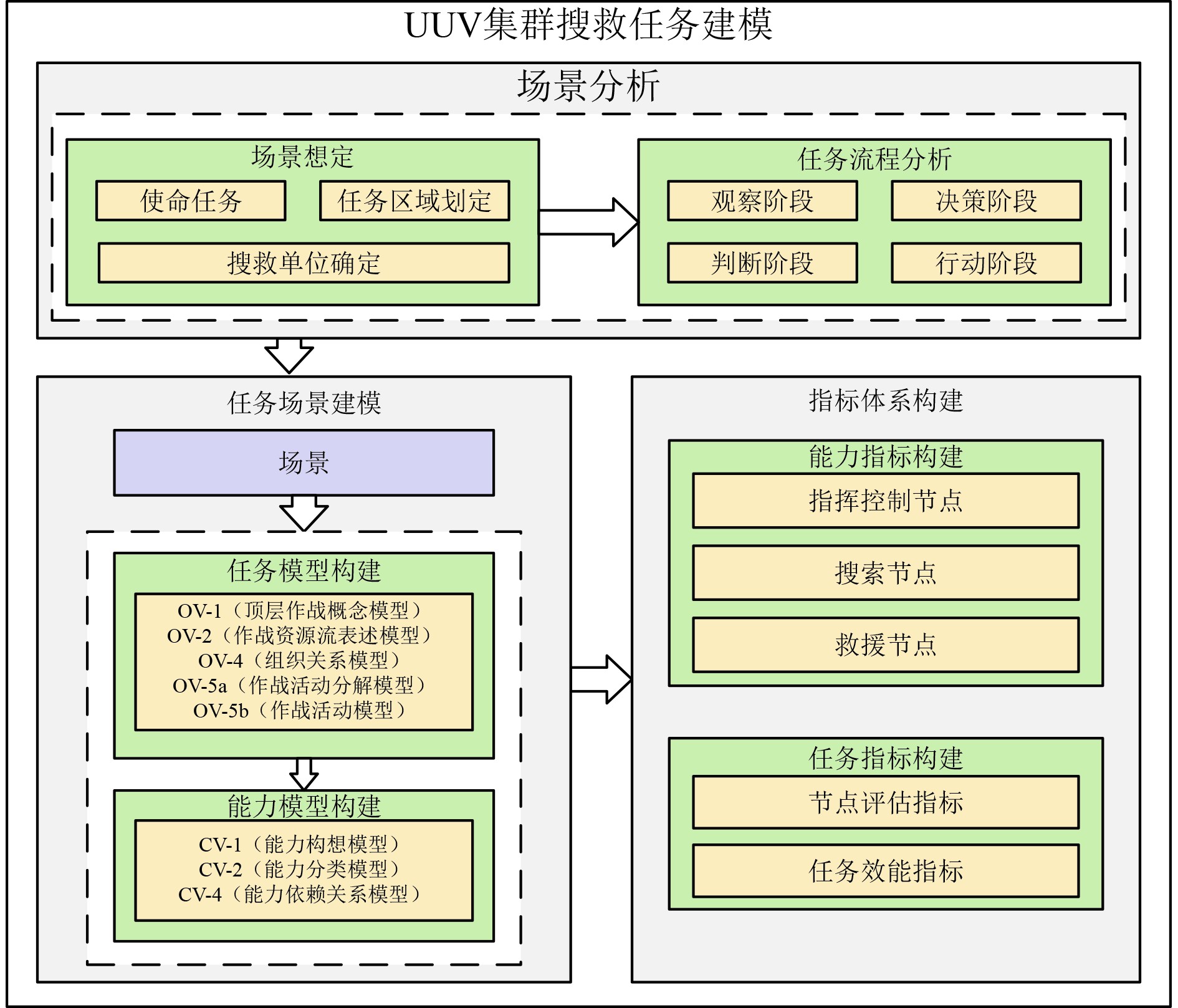 本文面向UUV集群搜救任务场景,提出一种融合MBSE建模思想、DoDAF架构视图与OODA环理论的UUV集群搜救任务建模框架,旨在构建具备一致性、结构化与可评估特征的搜救任务模型体系,包括全视角模型、任务视角模型、能力视角模型,以及效能评估指标体系。