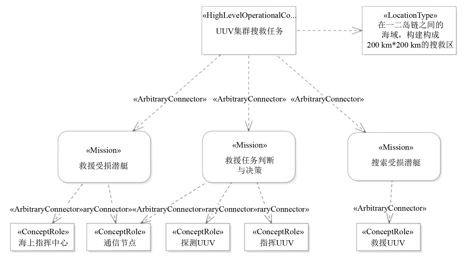 DoDAF 2.0多视角建模框架包括全视角、任务视角、能力视角,以下从这3个方面对UUV集群搜救任务场景进行建模。