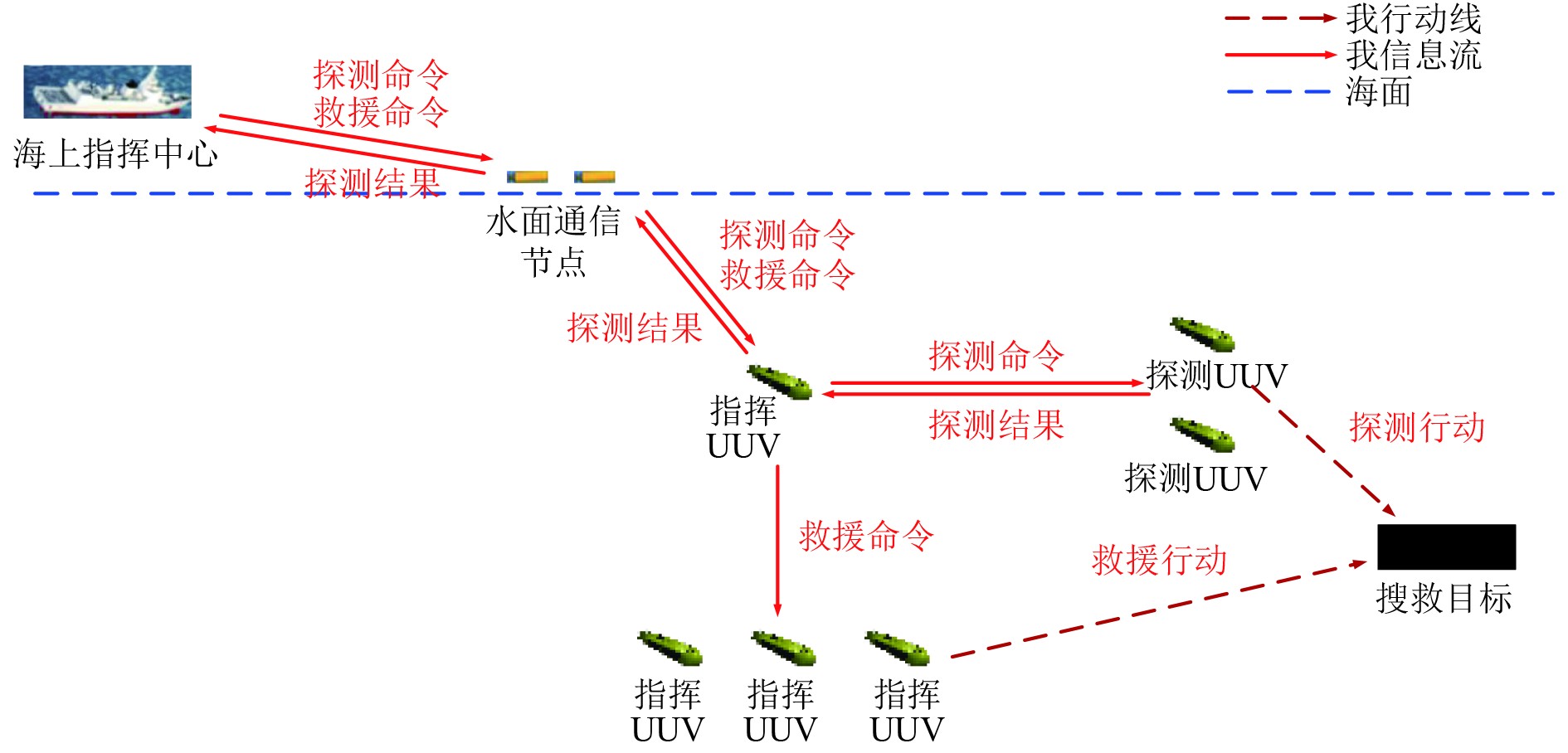 1)指挥控制节点:作为体系的核心,负责任务规划和资源调度。由海上指挥中心和指挥UUV组成,海上指挥中心负责下发任务指令和态势分析,而指挥UUV则对探测UUV和救援UUV进行任务规划和控制。