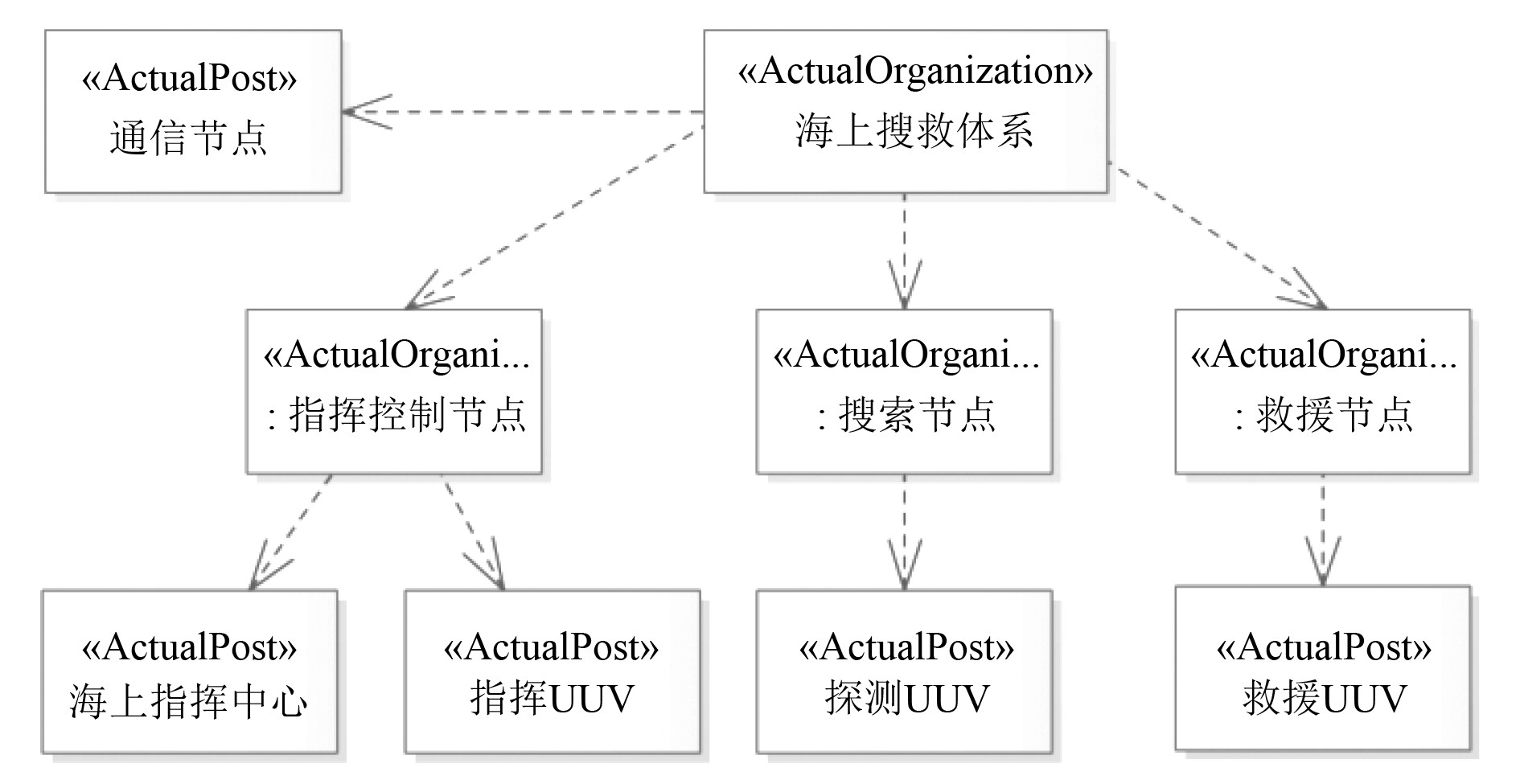 如图9所示,组织关系模型(OV-4)主要用于描述参与活动的组织实体及其相互关系。组织关系模型通过图形化方式展示组织间的指挥、协作、隶属关系,例如各单位间的协作机制。其核心目标是明确责任分工与权限边界,支持资源调配和决策流程分析。