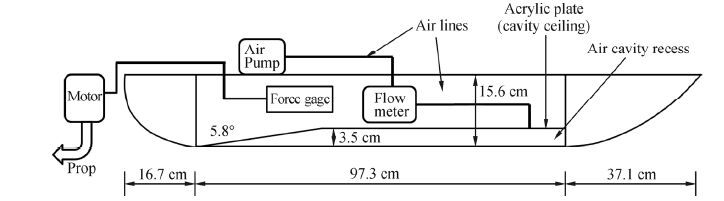 The air-cavity approach for reducing ship drag has been studied and experimented with in the past, but with mixed success(Basin et al., 1969; Latorre, 1997; Matveev et al., 2006.) A possible arrangement(among others)of an air cavity system on a ship hull is illustrated in Fig. 1. The only serially produced marine vehicles with air cavities are planing and semi-planing l and ing craft and small fast ferries built in Russia in the last two decades(Matveev, 2005). There are several on-going developments of air-lubricated systems for ocean-going cargo vessels(Ceccio, 2010). One of the technical reasons for the slow implementation of this concept is the complex hydrodynamic phenomena in the presence of air cavities. This results in a difficulty maintaining large-area cavities at small air flow rates on realistic hull forms in a variety of operational conditions, such as motions in rough seas. Several research groups are actively working on various aspects of the air-cavity concept(Amromin et al. 2011; Matveev and Miller, 2011; Shiri et al. 2012; Elbing et al. 2013; Mäkiharju et al. 2013; Jang et al. 2014). The air-cavity approach for reducing ship drag has been studied and experimented with in the past, but with mixed success(Basin et al., 1969; Latorre, 1997; Matveev et al 2006.) A possible arrangement(among others)of an air cavity system on a ship hull is illustrated in Fig. 1. The only serially produced marine vehicles with air cavities are planing and semi-planing l and ing craft and small fast ferries built in Russia in the last two decades(Matveev, 2005). There are several on-going developments of air-lubricated systems for ocean-going cargo vessels(Ceccio, 2010). One of the technical reasons for the slow implementation of this concept is the complex hydrodynamic phenomena in the presence of air cavities. This results in a difficulty maintaining large-area cavities at small air flow rates on realistic hull forms in a variety of operational conditions, such as motions in rough seas. Several research groups are actively working on various aspects of the air-cavity concept(Amromin et al. 2011; Matveev and Miller, 2011; Shiri et al. 2012; Elbing et al. 2013; Mäkiharju et al. 2013; Jang et al. 2014).