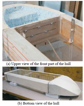 Due to the exploratory nature of this research-oriented project, a modular design was initially chosen to make it easy to adjust for different scenarios. This meant the hull construction involved building the bow stern and main hull sections separately. All three sections of the vessel were made of Styrofoam closed-cell foam. The foam blocks were roughly shaped using a hotwire device to cut through the foam and melt it at the same time. The hotwire was used because it could make clean edges and complex contours. These shapes were then s and ed smooth to achieve the final shape and size. A layup of fiberglass was wrapped around each foam section in order to create a hard, smooth shell to protect and strengthen the model. The fiberglass was then s and ed to remove wrinkles and to provide a smooth surface. The sections were then coated with fiberglass microballoons to fill in gaps and provided a s and able surface. Plywood plates were then attached to the inside of the main hull sections and joined with a carbon fiber and composite plate at each end to form a box with neither top nor bottom. The bow and stern sections where then bolted onto the main body with the composite plates becoming the connection surfaces between the two sections attached to each other with plastic nuts and bolts(Fig. 4).