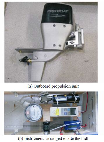 2.2 Equipment and instrumentsIn order to propel and control the boat, an electric propulsion system and radio-controlled equipment were installed on the boat. An outboard propulsion unit Pro Boat PRB4020 made by Horizon Hobby and commonly used for fast radio controlled(RC)boats(Fig. 5)was chosen in this project for ease of directly measuring the thrust force. This unit includes a brushless electric motor, which is controlled in the present setup with an 80-Amp electronic speed controller(ESC)Dynamite DYNM3820(also made by Horizon Hobby). The outboard motor frame was connected to the servo via a clevis and pushrod in order to produce change in the propulsion direction which acted as steering. In order for the motor and servo to be controlled from the shore, a Futaba receiver R617FS was installed that matched Futaba T7C transmitter used.