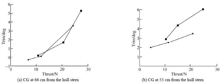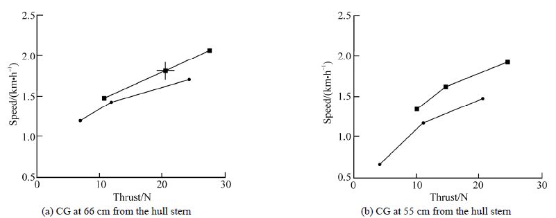 Results shown in Fig. 6 clearly indicate a speed increase with the thrust, as expected. It is also obvious that the air-cavity hull achieves substantially higher speeds at similar thrust values than the “solid” hull with a flat bottom(Fig. 6). A somewhat inferior performance of the hull with the back CG position(Fig. 6(b))is likely caused by more pronounced trim of this hull(Fig. 7). However, the air-cavity advantage is still present in this setup(Fig. 6(b)).