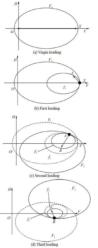 2)The elastic domain is surrounded by theyield surface, which becomes to be a point and the plastic flow turns up for loadincrement within the bounding surface. Other than the classic yield surface, there is a loading surface within the domain surrounded by the bounding surfacethat represents a single loading event and reflects the anisotropic characteristicof the soil.