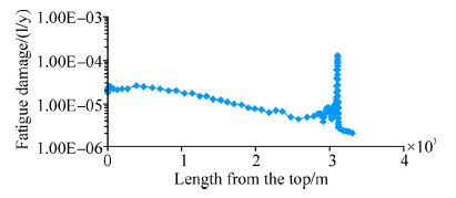 So, the riser fatigue life can be predicted bythe method of the S-N curve and Rainflow counting technique. The fatigue damageof the example riser can be obtained in the SW direction consisting of 15seastates with different probabilities of occurrence. The SCR fatigue damageresults of every seastate were added together with the probability of occurrence.The whole SCR fatigue damage and fatigue life were achieved and the fatiguedamage results are shown in Fig. 4. It can be seen that the maximum fatiguedamage result is located at the TDZ.