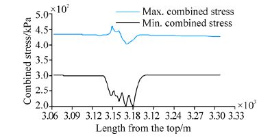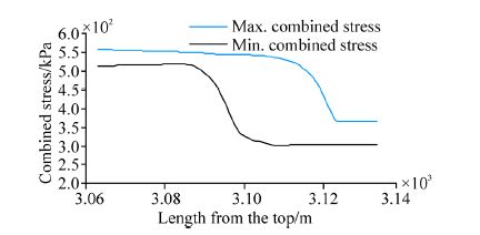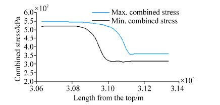 The maximum and minimum combined stresses atthe TDZ of the two models in the vertical are shown in Fig. 7 and Fig. 8 From the comparisonof the two figures, it can be judged that the margin between the maximum and minimum combined stresses of the spring element model is more remarkable, thatis, the cyclic amplitude is larger. So, the fatigue of the springelement model is more severe.