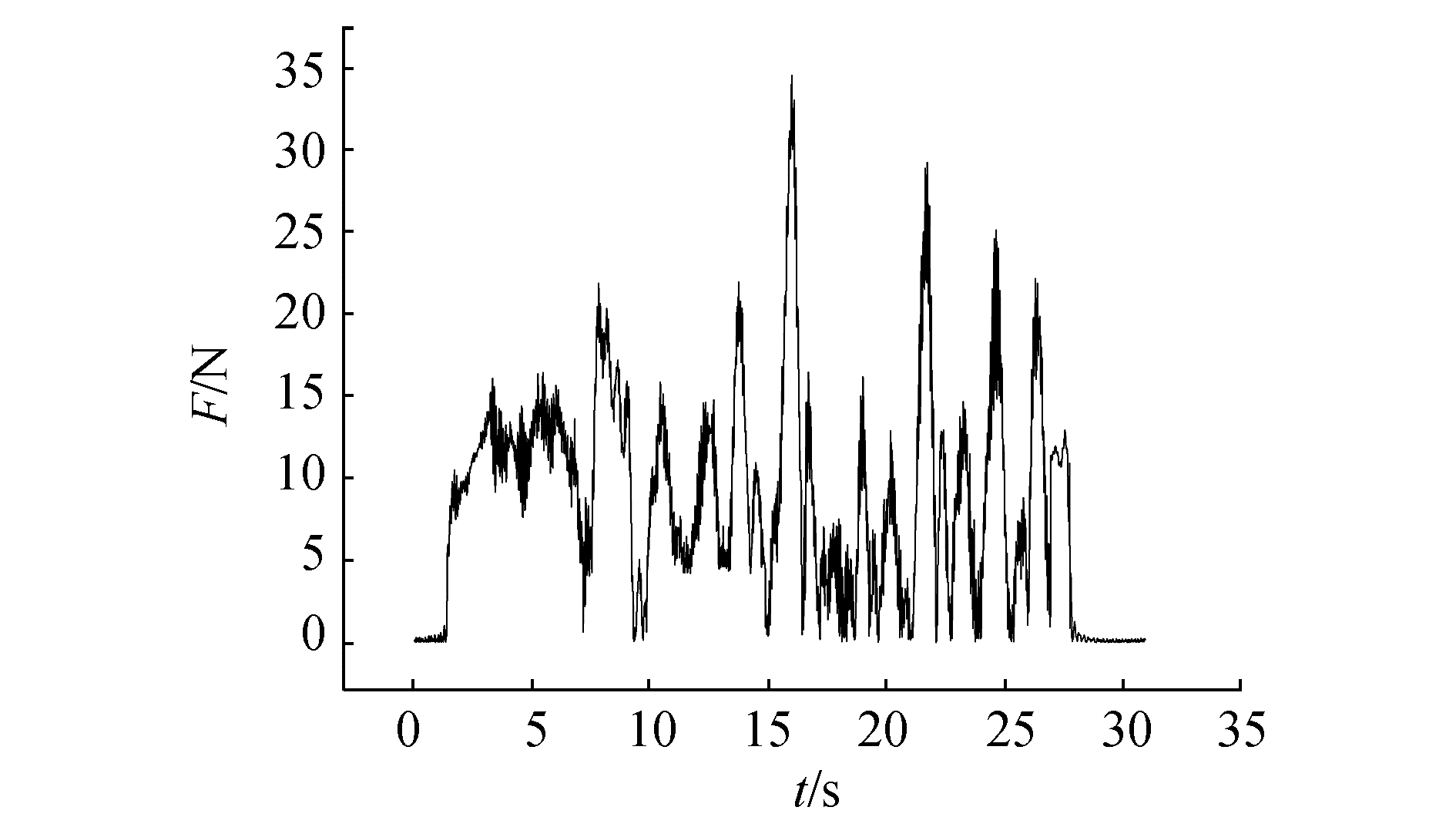 Furthermore,when the ice failure is dominated by bending,a relatively slow fluctuation of the resistance was subsequently and frequently observed. This subsequent fluctuation characteristic can be attributed to the rotation of a large ice block. Similar fluctuation characteristics can also be observed in the other test records,as shown in Figs. 10-14.