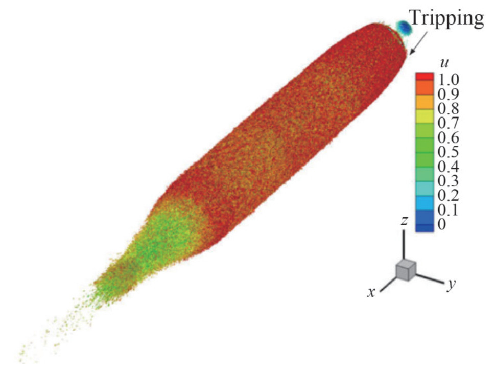 In numerical studies on the flow of underwater vehicles with a model scale, many scholars (Kumar and Mahesh, 2018a; Morse and Mahesh, 2021; Posa and Balaras, 2016, 2020; Rocca et al., 2022) also employed a numerical disturbance approach at the bow region to artificially induce the transition. The numerical disturbance was usually achieved by adding the steady wall-normal velocity or force source term on the wall boundary on the special position of the forebody. This method will lift the boundary layer and quickly induced the transition of an laminar boundary layer into a turbulent state.