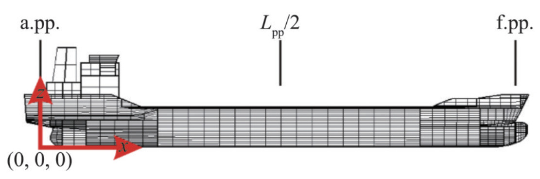 Table 1 Main particulars of the CTItems Full scale Model scale Loa (m) 170.0 2.428 Lpp (m) 161.0 2.300 Breath (m) 28.0 0.400 Depth (m) 13.0 0.186 Draft (m) 9.0 0.129 Displacement (t) 30 666 0.894 Lcg (m) 82.466 3 1.178 09 Vcg (m) 6.151 6 0.087 88 Rxx (m) 9.31 0.133 Ryy (m) 32.9 0.47 Rzz (m) 33.53 0.479 2.2 Model equipment and test setup