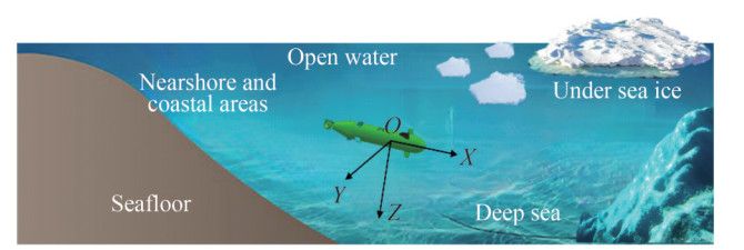 ROVs are unmanned underwater robots that are controlled by an operator aboard a vessel or onshore (Nitonye et al., 2021). ROVs are typically tethered to the surface by an umbilical cable that provides power and allows for realtime control and data transmission. ROVs are equipped with cameras, sensors, and various tools to perform tasks such as inspection, maintenance, and repair of underwater structures, exploration, scientific research, and military operations. AUVs are robotic devices equipped with integrated computers that facilitate independent operation and navigation, free from external command or human piloting. They are distinguished by their prolonged operational endurance, high efficiency, and extensive survey range. AUVs are deployed in four typical working environments: open water, under ice, nearshore and coastal areas, and deep sea, as shown in Figure 1. Given its ability to navigate autonomously beneath the water's surface and its versatility in accommodating customizable payloads, AUV emerges as an optimal instrument for a diverse array of purposes, including underwater archaeology, military applications, and oceanographic observations (Brito et al., 2010). AUVs are capable of operating in a diverse range of underwater contexts, from open ocean to coastal proximities. Their operational scope is broadening to include more challenging non-benign environments, such as areas beneath sea ice or along rugged coastlines, which inherently increases the potential risk of AUV loss (Brito et al., 2012). ROVs don't rely on battery power but are connected to surface vessels by umbilical cables, thereby avoiding mission interruptions caused by battery failures. Additionally, ROVs are controlled in real-time by operators on the surface, allowing for rapid adjustments and problem-solving in the event of unexpected situations. This human intervention significantly enhances the success rate of missions and the safety of the equipment. In contrast, AUVs rely on battery power, making success rate and equipment safety dependent on battery performance. Although AUVs have greater autonomy since they are not limited by the umbilical cable length or the mother ship's position, their communication capabilities are limited when operating underwater. This limitation prevents operators or monitoring teams from promptly obtaining status information, thereby increasing the risks AUVs face in complex environments and reducing their reliability to a certain extent.