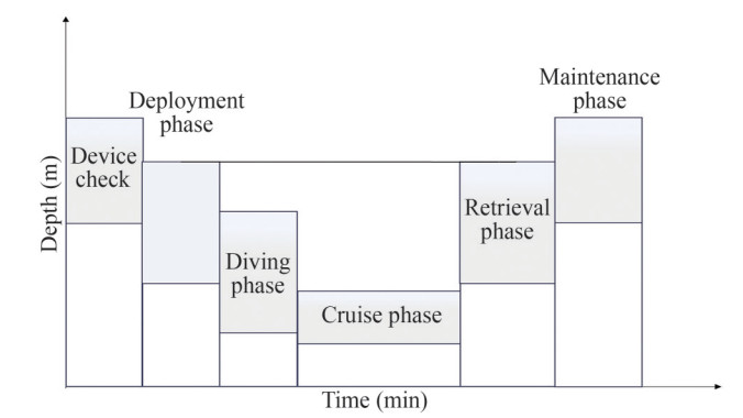 Taking a scientific exploration AUV as an example, the mission profile of an AUV is shown in Figure 4. The mission profile of a scientific exploration AUV is divided into: AUV device check, AUV deployment phase, AUV diving phase, AUV cruise phase, AUV retrieval phase, AUV maintenance phase.