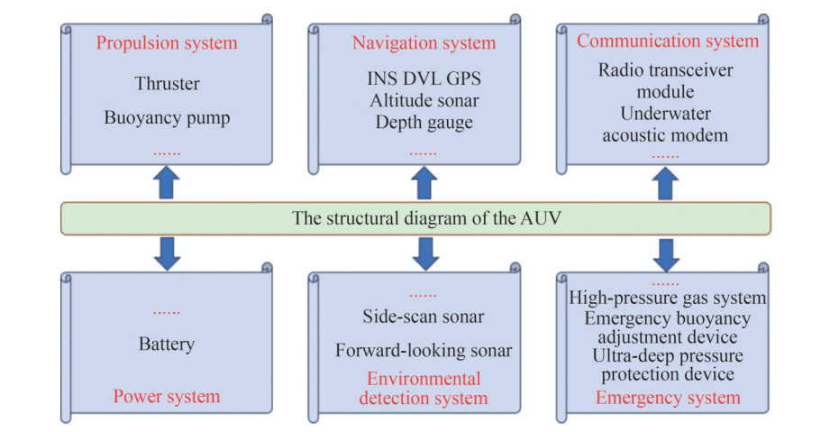 Table 5 The typical failure modes and causes of environmental detection subsystemFailure modes Failure effects Failure causes Forward-looking sonar failure AUV is unable to provide timely warnings or take evasive actions Physical damage such as impact or collision, sensor damage, software malfunction Side-scan sonar failure Decreased target detection capability Physical damage such as impact or collision, sensor damage, design flaws Camera pollution or damage Decreased detection capability Physical damage such as impact or collision, aging of connection lines 2.2.6 Emergency subsystem