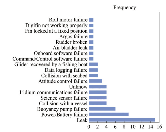 Figure 6 Failure modes and their frequency during 63 abort incidents from 205 glider missions (Brito et al., 2014)