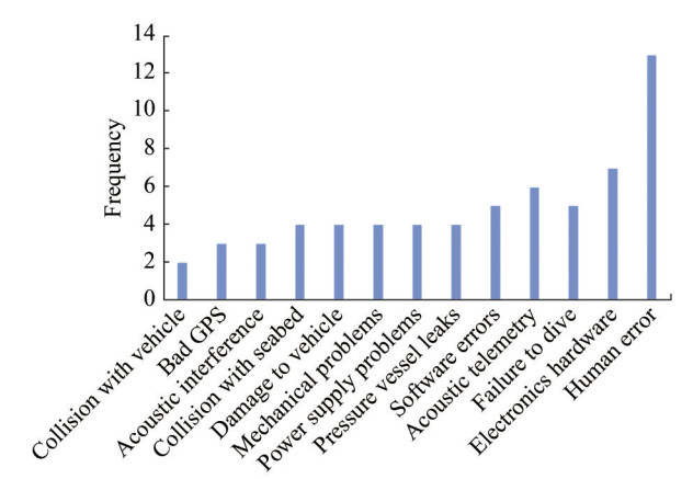 Figure 9 Failure modes and their frequency during missions 1-240 of the Auto sub3 AUV from 1996 to 2000 (Griffiths et al., 2003)In recent years, there has been a growing recognition among researchers regarding the significance of human reliability and risk analysis in the field of AUVs. Loh et al. (2020a) presented a systems-based risk analysis framework facilitated by system dynamics methodology that was applied to an ongoing AUV program to analyze incidents of human error during Antarctic deployment. The simulations conducted using the resulting risk model demonstrated a decrease in the incident rate of human errors as the AUV team's experience increased. In a related study (Thieme et al., 2015), a risk management framework (RMF) for UUV was proposed. This framework highlights the significance of considering the influence of human and organizational factors on risk.