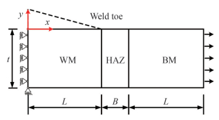 The smooth specimen is assumed to be manufactured from a welded joint, with the excess WM removed, as shown in Figure 1. The thickness of the specimen is t. The specimen comprises three material zones, and the length of each zone is L, B, and L.