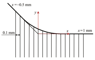 A simplified inhomogeneous model based on the measured hardness at y = −0.1 is constructed. The hardness distribution along y = −0.1 is formulated using linear interpolation of measured data points. The shaded area in Figure 6(a) is divided into three material zones: x = [−3 mm, −0.5 mm], x = [−0.5 mm, 1 mm], and x = [1 mm, 2.8 mm]. The second material zone is further divided into material stripes with a width of 0.1 mm, as shown in Figure 10. The hardness of each zone or strip is calculated by averaging the hardness distribution in the zone or strip. The material properties of each zone or strip are determined in accordance with Section 2. The results are compared with those from the detailed inhomogeneous model, as shown in Figure 11.