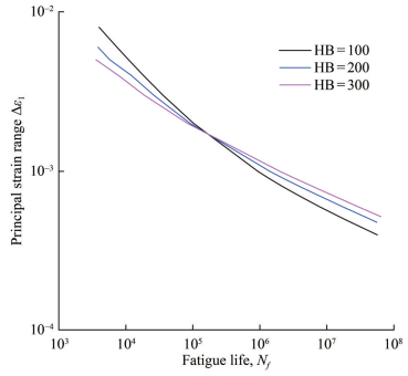 $$\sigma_{1, \max } \frac{\Delta \varepsilon_1}{2}=\frac{\sigma_f^{\prime 2}}{E}\left(2 N_f\right)^{2 b}+\sigma_f^{\prime} \varepsilon_f^{\prime}\left(2 N_f\right)^{b+c}$$ (9) where σ'f is the fatigue strength coefficient, b is the fatigue strength exponent, ε'f is the fatigue ductility coefficient, c is the fatigue ductility exponent, Nf is the number of cycles to fatigue failure, Δσ1 is the principal strain range, and σ1, max is the maximum stress on the principal strain range plane. The relationships between the fatigue property and the hardness are shown in Table 2 (Roessle and Fatemi, 2000).