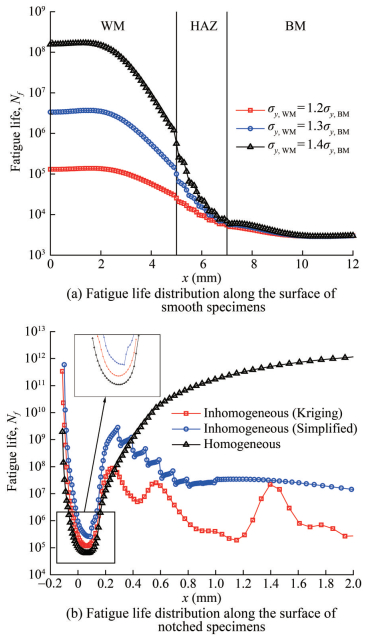 Figure 13(a) shows the fatigue life distribution along the smooth specimen surface (the number of HAZ subzones is 5). The load amplitude is σy, BM, and the load ratio is −1. Notably, the fatigue life distribution of the smooth specimen is generally opposite to the plastic strain amplitude distribution, as shown in Figure 5(b). A high plastic strain amplitude corresponds to a low fatigue life. Moreover, the fatigue life of WM increases with the mismatch ratio. If the effect of residual stress and the existence of defects are ignored, then the fatigue crack is more likely to be initiated at the BM a few millimeters away from the HAZ.