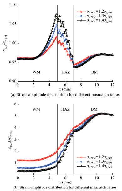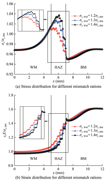 The applied monotonic load is equal to σy, BM. The stress and strain distribution along the upper surface of the specimen, i. e., the x axis, is obtained. The stress and strain in the x direction are normalized based on the applied load. Figure 3 shows the effect of mismatch ratios on the stress and strain distribution. Notably, considering the stress distribution from the WM to BM, the stress increases to a maximum near the HAZ and then decreases to a minimum near the BM, close to the HAZ.