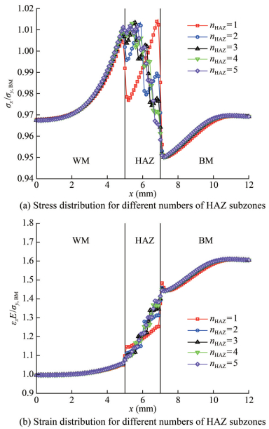 Figure 4 shows the results corresponding to the conditions where the yield stress of the WM is 1.2 times that of the BM, and the HAZ is divided into nHAZ = 1–5 subzones. Notably, the number of subzones drastically affects the stress and strain distribution in the HAZ. The local fluctuations in stress and strain decrease with nHAZ. Furthermore, a low nHAZ does not effectively capture the maximum stress.
