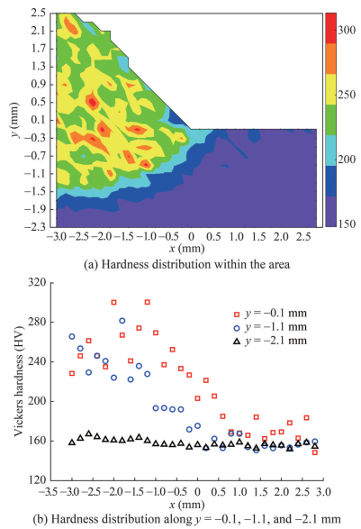 The microhardness around the weld toe of a fillet-welded T-joint was measured. Mild steel (AH32) with a thickness of 6 mm was used as the BM. Welding was performed using the GMAW process with TWE-711 wire. The geometry of the T-joint is shown in Figure 6(a). Wire electrode cutting was conducted to prepare the specimen for microhardness measurement. A Vickers microhardness tester was used, with a dwell time of 15 s and an applied load of 200 g. The measurements were taken in the shaded area, as shown in Figure 6(a). The origin of the coordinate is located at the weld toe. The distance between two measurement points along the x and y axes is 0.2 mm, and the indenter marks within the area are shown in Figure 6(b). The first row of indenter marks beneath the BM surface is located at y = −0.1 mm.
