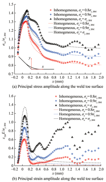 The cyclic load is applied to the inhomogeneous model, and the principal stress amplitude and principal plastic strain amplitude along the weld toe surface are obtained. Figure 9 shows the results as a function of x for three cyclic loads with amplitudes of 0.8σy, BM, 0.9σy, BM, and σy, BM, respectively. The origin of the coordinate system is also shown in the figure. The detailed inhomogeneous model is believed to produce highly reliable results because all the measured data are considered. The results from a homogeneous model are also shown for comparison. Using the material properties of the crack initiation site, that is, the weld toe, to estimate the notch stress and strain of welded joints is a common practice. The material properties of the homogeneous model are derived based on the hardness of the measurement point near the weld toe, which is HV = 203.