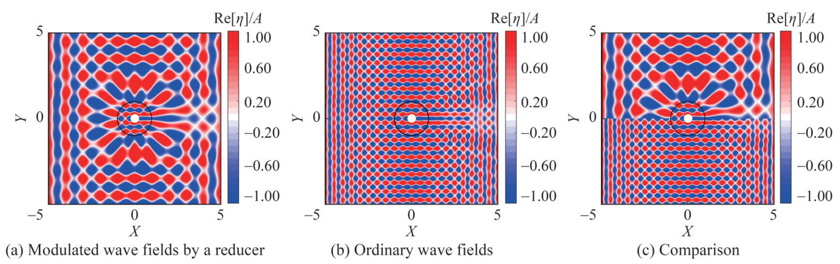 First, the vertical cylinder arranged at the center of the wave field of the reducer, as shown in Figure 4(b), was considered. Notably, the no-flux boundary condition (∂η/∂ n = 0) is satisfied on the surface of the cylinder. In this case, the incident wavelength λ0 is 1.0 m. As shown in Figure 4 (b), using the reducer, the wavelength λ in the operating space (r < 1.0 m) is reduced to 0.5 m. Thus, the wavelength λ around the cylinder is 0.5 m. Figure 10(a) shows apparent scattering by the vertical cylinder. As shown in Figure 10(b), the wave distribution of the vertical cylinder in an ordinary wave field was calculated to validate the manipulation of hydrodynamic performance by the reducer. The incident wavelength is set at λ0 = 0.5 m. Notably, the scattering wave field at r < 1.0 m (inside the black circle) is the same as that in Figure 10(a) despite varying wave fields outside the black circle. Assume that the wave field of λ = 0.5 m shown in Figure 10(b) is the target wave field, where the structure can effectively reach hydrodynamic performance. Therefore, the reducer can be used to modify the original wave fields (λ = 1.0 m) to the target wave fields (λ = 0.5 m) to reach good hydrodynamic performance of the structure. Figure 10(c) represents the comparison between the wave distribution of the vertical cylinder in the modulated wave field and the ordinary (target) wave field. The upper and lower parts are the wave distributions of the reduced and the original fields, respectively. The scattering wave fields around the cylinder are the same. Based on energy conservation, the hydrodynamic characteristics of the cylinder in the two wave fields are the same.
