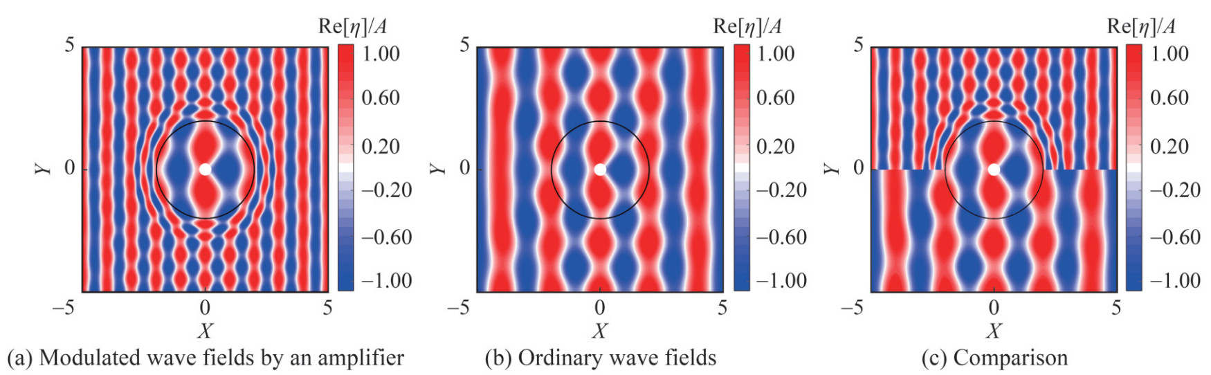 3) The interactions between a vertical cylinder and modulated water waves were analyzed. The wave distributions around the cylinder in the modulated wave fields and the equivalent ordinary wave fields were calculated. The results demonstrate that the scattering characteristics of the cylinder in the modulated wave fields are similar to those in the equivalent ordinary wave fields. Based on energy conservation, the modulators can manipulate the wavelength to achieve the target hydrodynamic performance of the offshore structure.