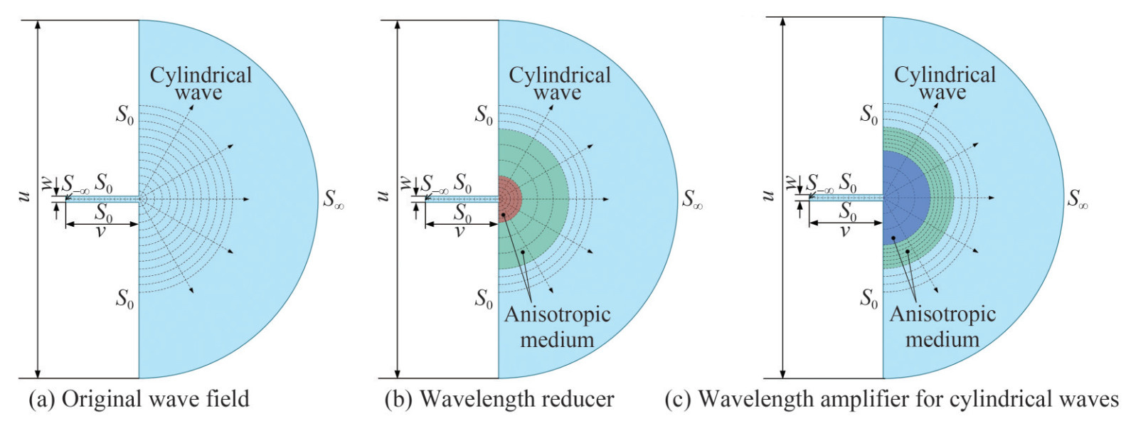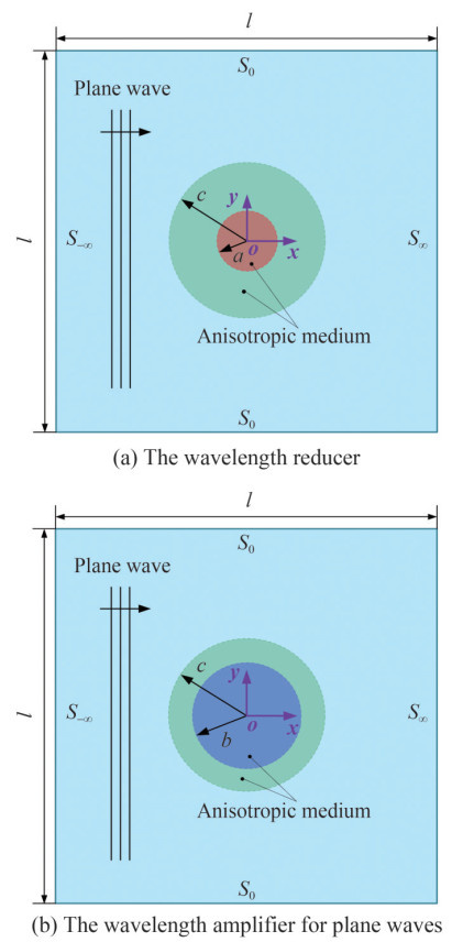 A finite element method, based on the COMSOL Multiphysics software, was used to solve the Helmholtz equation with an anisotropic medium, as shown in Eq. 10(a). The boundaries S0 satisfies the no-flux boundary condition, while the scattered boundary condition is applied at S−∞ and S∞. Additionally, the incident plane wave ($ \eta_0=A \mathrm{e}^{-\mathrm{i} k_0 x}$) is generated at S−∞, with A representing the wave amplitude. The wavelength λ0 and the amplitude A of the incident waves are set to 1.0 and 0.1 m, respectively. The overall scopes of the reducer and the amplifier are both r < c, while their operating scopes are r < a and r < b, respectively.