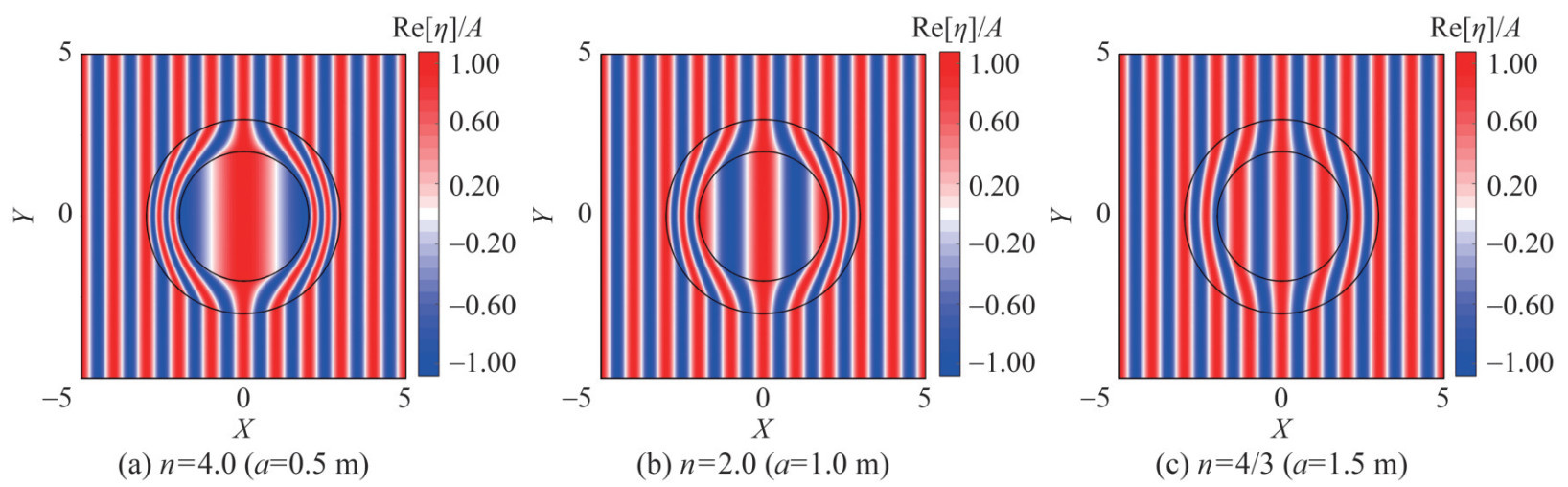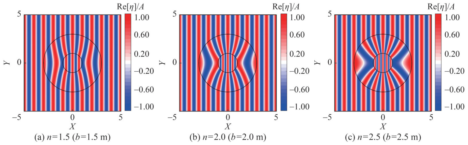 First, the wave distributions (Re[η]/A) of the reducer were investigated. Herein, a is 1.0 m, and c is 3.0 m (m = 3.0). The scaling ratios n (= b/a) can be controlled by varying the values of b. Three scaling ratios, n = 1.5 (b = 1.5 m), 2.0 (b = 2.0 m), and 2.5 (b = 2.5 m), were considered to investigate the reduced wavelength. The wave distributions for n = 1.5, 2.0, and 2.5 are shown in Figures 4(a), (b), and 4(c), respectively. The reduced wavelength in the operating spaces of the three reducers varies, indicating that the control method for scaling the wavelength ratios is efficient. Figure 5 shows the wave profile along y = 0 for the three reducers. As expected, the wavelength in the operating spaces is reduced to 2/3 m, 1/2 m, and 2/5 m of n = 1.5 (b = 1.5 m), 2.0 (b = 2.0 m), and 2.5 (b = 2.5 m), respectively.