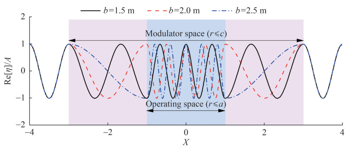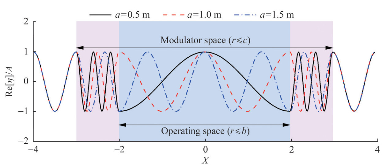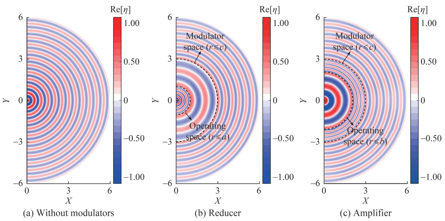 The wave distributions (Re[η]) modulated by the reducer and the amplifier were calculated, as illustrated in Figure 9. Herein, only the wave fields within the semicircle domain are presented. For comparison, the original wave field without any modulators is shown in Figure 9(a), where the cylindrical wave field is successfully generated. The wave distributions modulated by the reducer and the amplifier are demonstrated in Figures 9(b) and 9(c), respectively. The results indicate that the wavelength in the operating spaces of the reducer and the amplifier can be successfully reduced or amplified as expected. Therefore, the cylindrical waves can also be manipulated by the proposed wavelength modulators. Additionally, within the modulation space, the wavelength manipulation inside the operating space differs from that outside this space. Specifically, for the reducer in Figure 9(b), the wavelength inside the operating space (r < a) is reduced to 1/2λ0, while that outside the operating space (a < r < c) is amplified to 2λ0 (= (c−a)λ0/(c −b)). For the amplifier in Figure 9(c), the wavelength inside the operating space (r < b) is amplified to 2λ0, while that outside the operating space (a < r < c) is reduced to 1/2λ0 (= (c−b) λ0/(c−a)). Therefore, a single modulator can function as a reducer and an amplifier simultaneously. Notably, the wavelength scaling ratios of the cylindrical waves can be controlled by the dimensional parameters a and b.