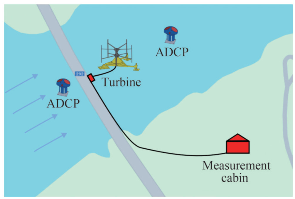 The water speed is logged by an ADCP placed approximately 15 m upstream of the turbine, and the river bed depth of the ADCP is assumed to be the same as that of the turbine. The device is a Workhorse Sentinel 1 200 Hz with an accuracy of 0.3% for water speed. Measurements are obtained every 3.6 s, and the velocity profile from 1 m above the bottom of the river to 1 m below the surface is determined. The logged data provide the cubic mean value of the vertical speed profile. The speed of the water at the measurement point of the ADCP is assumed to be constant until the water reaches the turbine.