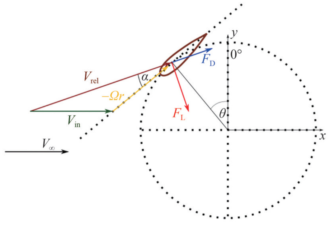 The implementation of the ALM necessitates lift and drag coefficient values for different angles of attack and Reynolds numbers characteristic of blade motion. The relative speed and angle of relative wind (Vrel and φ, respectively) are calculated on the basis of the geometric relationship between the tangential speed of the blade (Vblade) and incoming flow (Vin) (typically smaller than the freestream speed V∞):